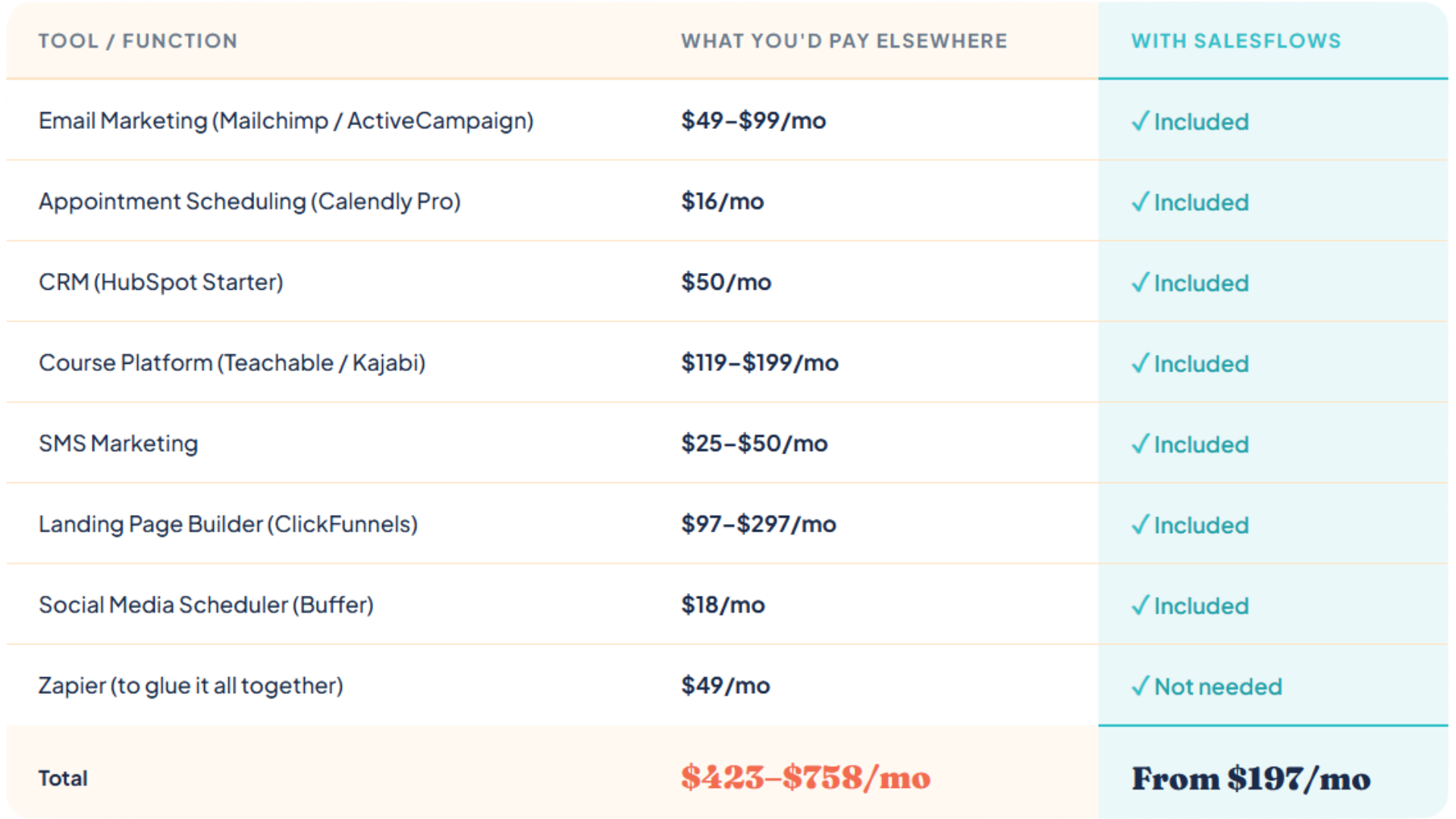 | Total monthly cost | From $197/mo Everything above · Cancel anytime |